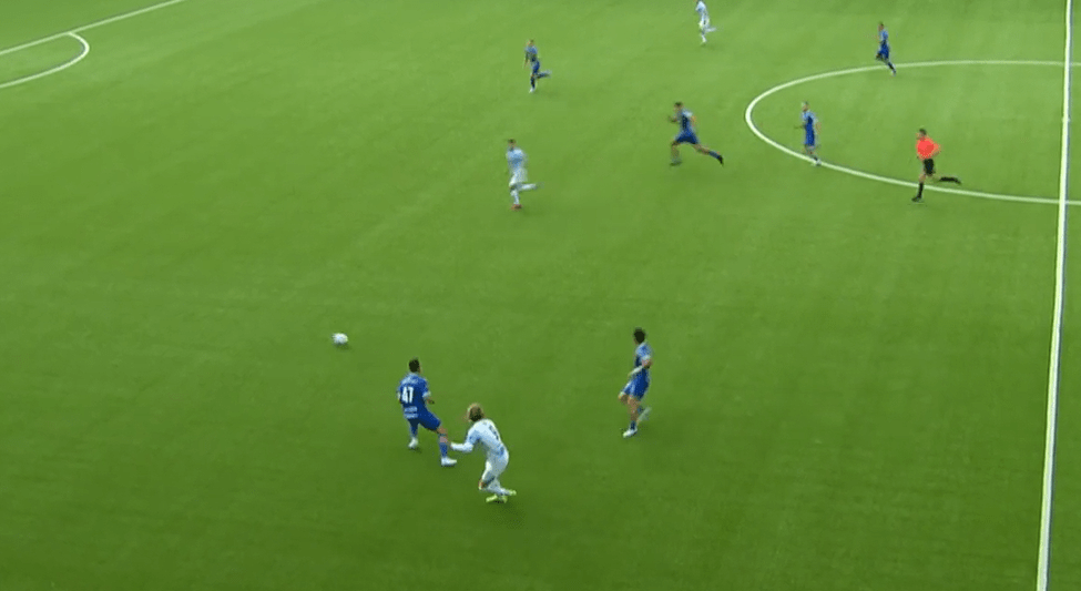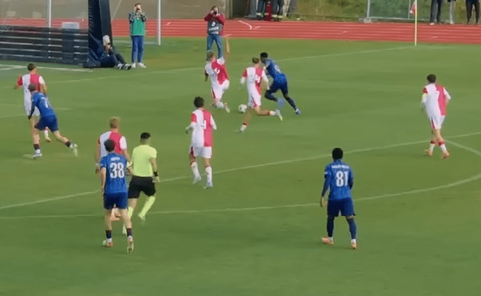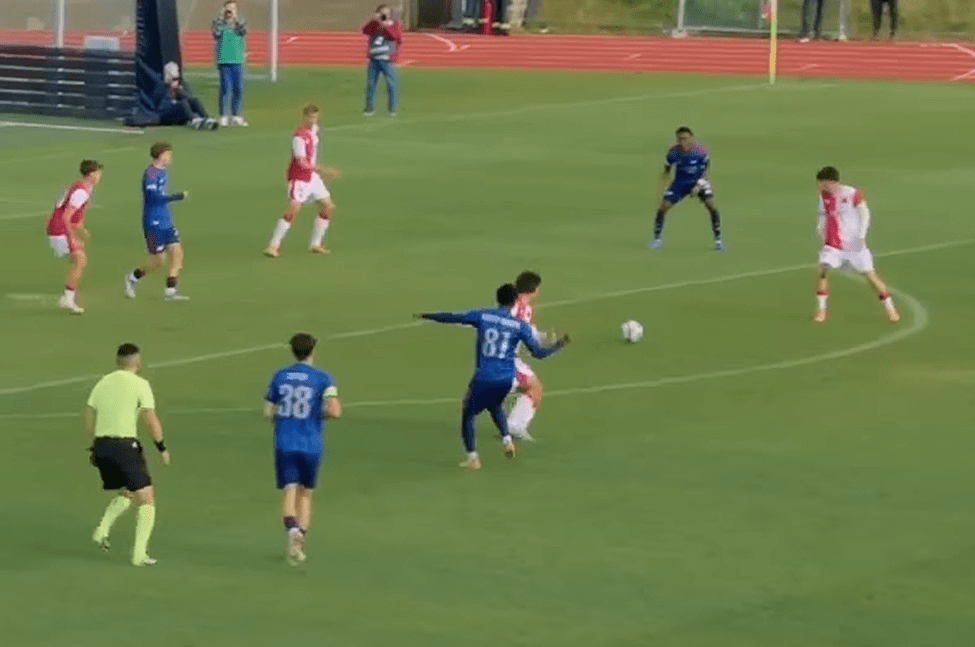 As previously mentioned, Sloncik is 1.89m tall (about 6’2″), and has a strong, while not bulky, frame. At just 18 years old, there is still plenty of time for him to reach his physical peak. With that in mind, the level shown by Sloncik already is very impressive for his age. While playing at the U19 level, Sloncik is regularly one of the more imposing figures on the pitch. He has solid pace/acceleration – while he might not beat out Micky van de Ven in a race anytime soon, he certainly has the foundation to reach a solid Top 5 League level. Sloncik showed aerial dominance at U19 level, but with signs that it can translate to senior team level. His height, strength and jumping ability make him a regular set piece threat in attack, and a strong aerial defender. I did not see him lose a single aerial duel at U19 level.