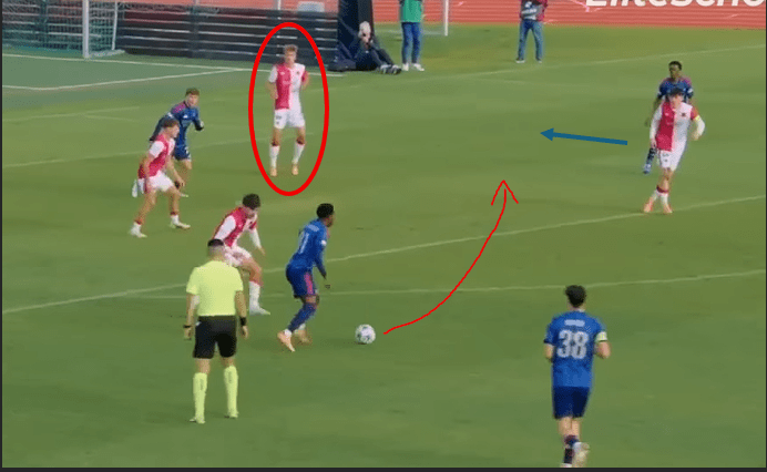 Off the ball, Sloncik was extremely impressive in his technical ability. His 1v1 defending, tackling, marking, and anticipation to make blocks were all best-on-the-pitch quality. In terms of the modern CB, Sloncik has the technical foundation desired by the majority of managers across the top leagues. Sloncik showed great use of angles and body position to effectively prevent his man from getting a scoring opportunity, as shown below in an example from his match against Arsenal U19.