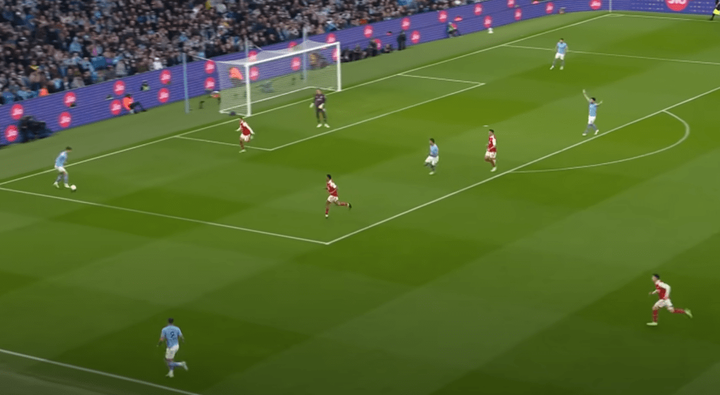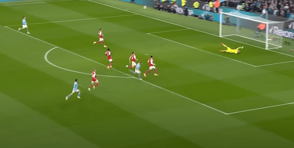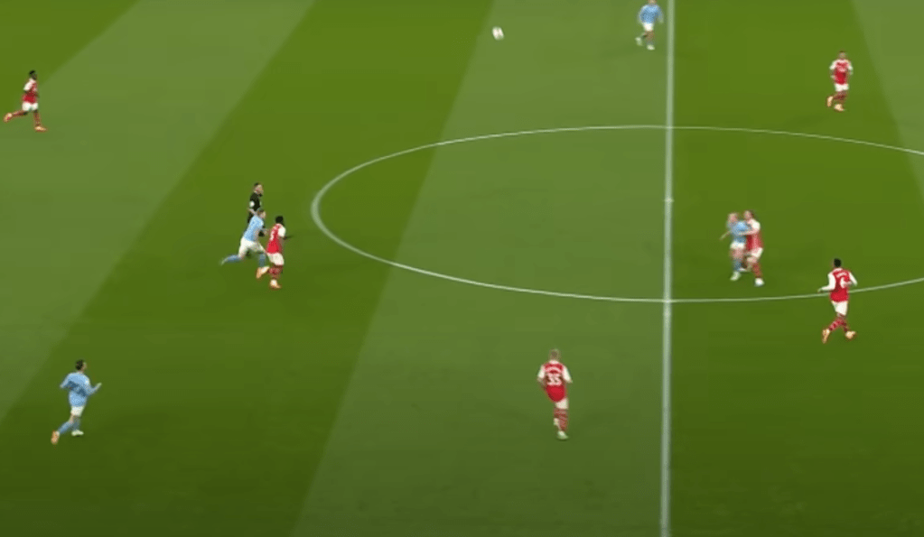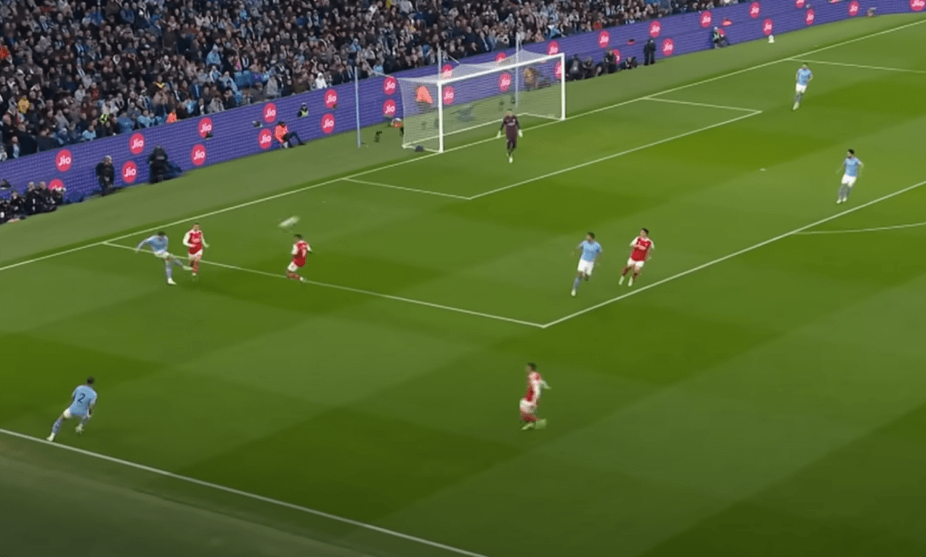 The target of this long ball? Erling Haaland of course. You can see how as the ball comes in to Haaland, he has gotten body positioning on Rob Holding and is able to control the ball down and make a pass to Kevin de Bruyne, who has slipped past Thomas Partey with his run through midfield: