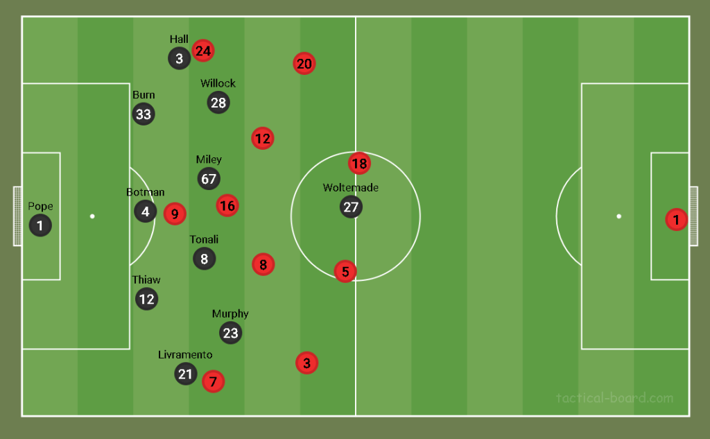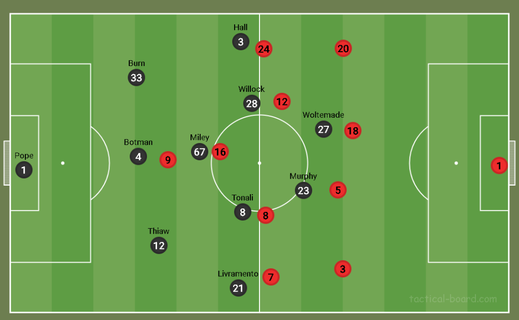 The recent addition of Malick Thiaw and Nick Woltemade also might have been a factor in choosing this formation, with both players having extensive experience playing in this formation in Germany. However, this was not a traditional-looking 3-5-2, mostly due to the versatile roles of Joe Willock and Jacob Murphy. In possession, Willock was generally the most advanced of the midfield 3, playing in the left channels. The more upfield Willock moved, Tonali compensated by dropping deeper alongside Miley. Jacob Murphy played a second striker role making forward runs behind the defence , often combining with Woltemade as the ST dropped deep.