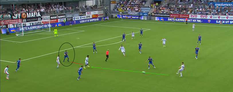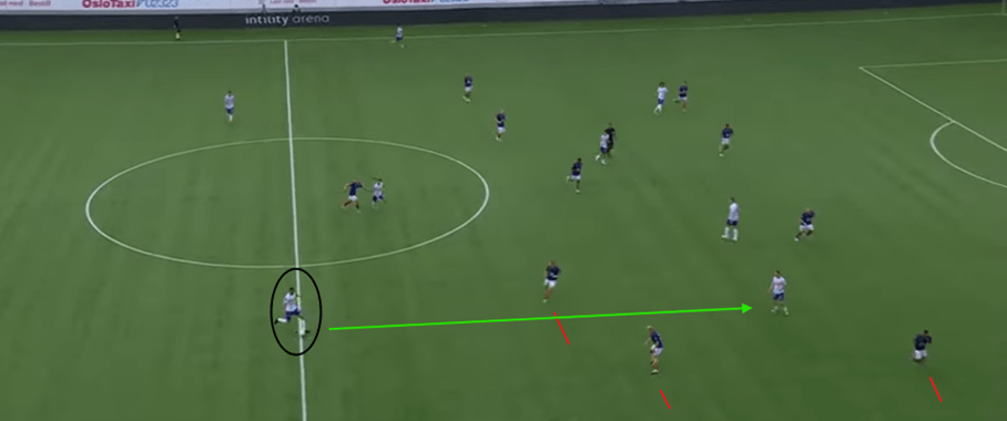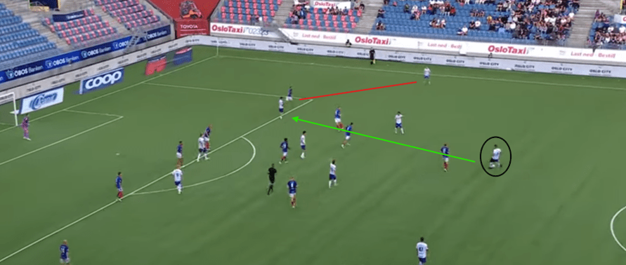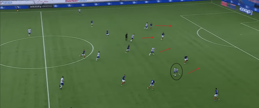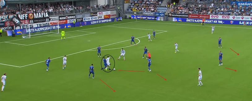 If Manchester City still had Gabriel Jesus, or even Sergio Aguero as the lone striker, they would be much less likely to win the aerial duel vs Arsenal’s CB and retain possession. Having the option to both play short through a press or send a long ball to the ST to hold possession, allowing midfielders to make supporting runs for a pass forward gives teams more unpredictability in their buildup, and forces the opposition to think twice about committing so many players forward to the press. This past season, Postecoglu’s Spurs encountered this difficulty, with Richarlison being their best forward equipped to perform this role. When he was not fit and Son Heung-Min played in the #9 role, there was a noticeable difference in Spurs’ ability to retain the ball when under high pressure in their own end of the pitch: teams could cover the short passing options, with some degree of confidence that a long ball towards their CB’s would be dealt with and the ball would be won back. Now I used this as an example because Son is clearly a world class player, but holding up the ball under physical challenges is not his biggest strength, one of the reasons he is more effective off the left wing. Having a physical striker able to win duels vs opposing CB’s offers a lifeline when the opposition is committing a lot of players up the pitch to press and at the same time, will offer more space to play out from the back, as the risk of the long ball needs to be considered by the defence before pressing.