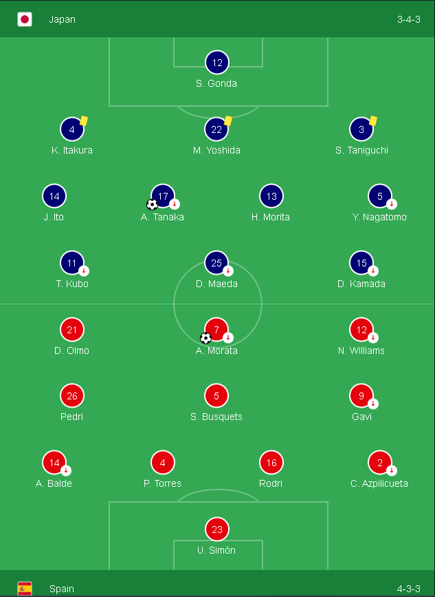 Second Half: it cannot be understated how infrequently Japan pressed the Spanish defenders in the first half. At first, it seemed like it was a tactical choice, as the Japanese frontline was on average, 13kg lighter than the Spanish centre-backs Rodri and Pau Torres who also held a considerable height advantage. As the second half started it became apparent that Japan was simply waiting for their moment to attack. This moment came as soon as the second half started, with Japan coming out looking like they had endless energy compared to the Spaniards. Daichi Kamada, Daizen Maeda, and the new substitute Ritsu Doan pressed the Spanish backline all the way into their own 6-yard box. Unai Simon was under heavy pressure from Maeda, and was forced to clear the ball to his left. The ball was won by Japan and fell to Ritsu Doan at the edge of the box, who cuts inside with his first touch and sends a determined drive to the right side of the goal, which Simon is able to get a touch on but cannot prevent from finding the net. Three minutes into the second half, and we have a tie game! Japan are not satisfied, and continue their endless pressing, winning the ball back shortly after Spain kicks off following the first Japanese goal. Ritsu Doan, full of confidence, beats Baldé in a 1-on-1 down the right wing, and squares a cross through the 6-yard box that goes through everyone, and looks to be going out for a Spain goal kick. The halftime substitute Kaoru Mitoma was unwilling to accept that, and burst to the goal-line, getting a touch on the ball and knocking it back towards the face of goal, where Ao Tanaka beat Rodri to the loose ball and knocked it home for Japan.